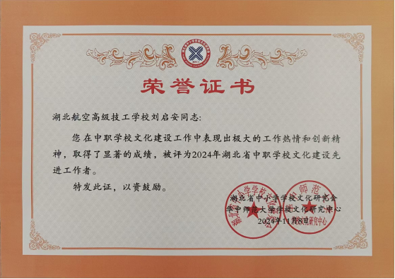 会议表彰了全省中职系统文化建设先进单位和个人。我校荣获“湖北省中职学校文化创新先进单位”荣誉称号,校长刘启安被评为“2024年湖北省中职学校文化建设先进工作者”。